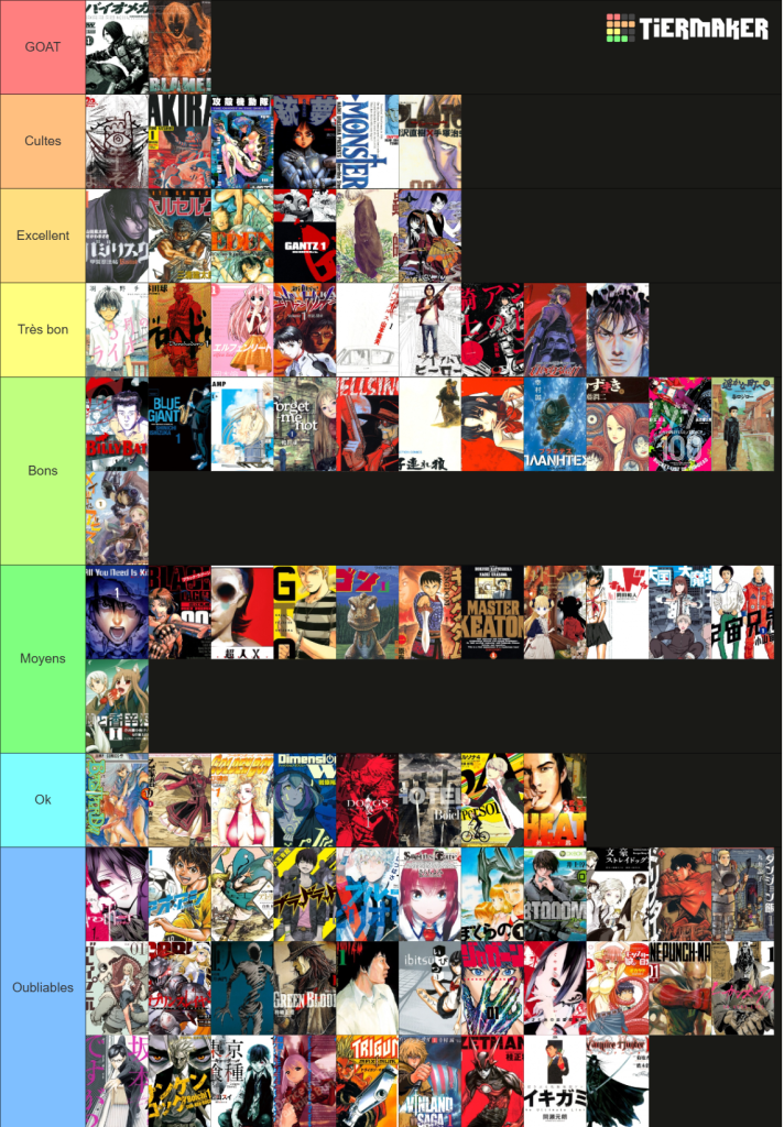 Après en avoir discuté sur Twitch, voici mon classement des meilleurs mangas (seinen, c’est-à-dire ceux destinés à un public adulte) :