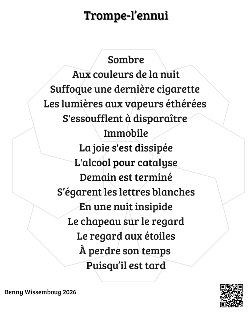 (Poésie) Trompe-l’ennui Partager : Partager sur X(ouvre dans une nouvelle fenêtre) X Partager sur Facebook(ouvre dans une nouvelle fenêtre) Facebook J’aime chargement… Similaire Laisser un commentaire Annuler la réponse. Δ